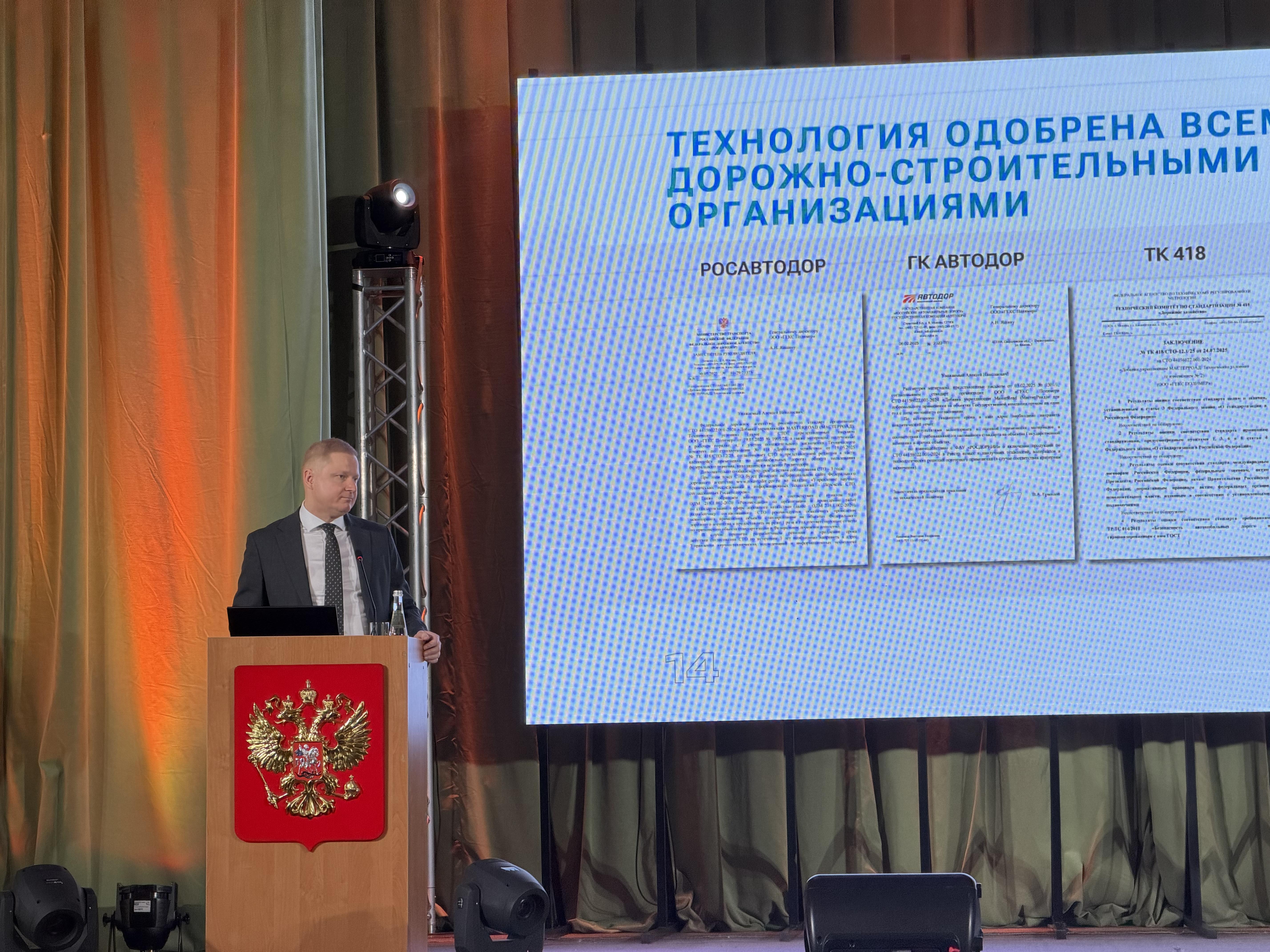 Специалист компании МастерРоад® выступил с докладом, подняв важную тему укрепления дорожных оснований за счет применения химических добавок. Также он рассказал о том, как производится добавка МастерРоад ОМС, и насколько важно ее применение для строительства дорог.